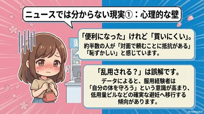 薬局で買えるようになったことは素晴らしい前進ですが、実は手放しで喜べることばかりではありません。制度が始まって見えてきたのは、法律やルールの壁は低くなっても、心理的な壁や地域による格差といった現実的な課題が残っているという事実です。ニュースの見出しだけでは伝わらない、現場のリアルな状況を5つのポイントから見ていきましょう。