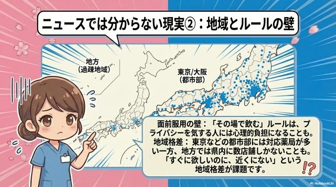 もう一つの大きな問題は「どこでも買えるわけではない」という点です。販売できるのは、特定の研修を受けた薬剤師が勤務し、個室があるなどの要件を満たした薬局に限られます。そのため、東京や大阪などの都市部では数百店舗が対応している一方で、地方によっては県内に数店舗しかないという地域も存在します。「すぐに欲しい」のに、近くに対応している薬局がない、あるいは車で何時間もかけないと行けないという「地域格差」が、命の選択肢の格差につながりかねない状況が生じています。