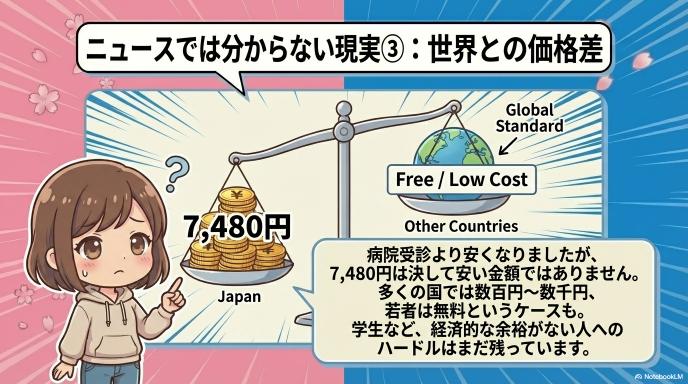 今回市販化された「ノルレボ錠」のメーカー希望小売価格は7,480円(税込)です。これまで病院で受診した場合、診察料を含めて15,000円前後かかっていたことを考えると、費用は約半分になり、アクセスしやすくなったと言えます。しかし、世界に目を向けると、多くの国では数百円から数千円で購入できたり、若者には無料で提供されたりしています。日本の7,000円台という価格は、特に経済的な余裕のない学生などにとっては、依然として決して軽くない負担です。世界基準に追いつくためには、費用の面でもさらなる議論が必要です。