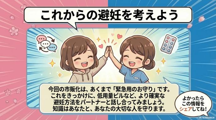 緊急避妊薬はあくまで「緊急用」のお守りです。今回のニュースをきっかけに、普段の避妊方法についても見直してみるのも良いでしょう。コンドームだけでなく、より確実性の高い「低用量ピル」を日常的に服用するなど、自分に合った避妊方法は他にもあります。実際にアフターピルを使用した多くの人が、その後低用量ピルの服用を始めています。自分のライフプランに合わせて、パートナーとしっかり話し合い、自分たちの未来を守るための選択をしていくことが大切です。