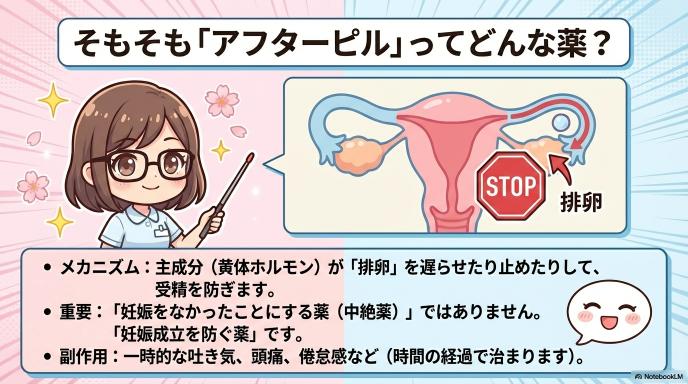 アフターピルという名前は知っていても、具体的に体の中で何が起きるのかを知らない人は意外と多いかもしれません。これは、避妊に失敗した性交の後、緊急措置として妊娠を防ぐために服用する薬です。主成分である黄体ホルモンの働きによって、排卵を遅らせたり止めたりすることで、受精の機会を防ぐのが主なメカニズムです。決して「妊娠をなかったことにする薬(中絶薬)」ではなく、あくまで「妊娠が成立するのを防ぐ薬」であるという正しい理解が大切です。副作用としては一時的な吐き気や頭痛、倦怠感などが報告されていますが、多くの場合は時間の経過とともに治まります。