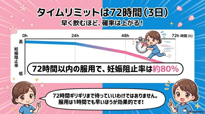 緊急避妊薬の効果を語る上で最も重要な数字が「72時間」です。性交後72時間(3日)以内に服用することで、妊娠阻止率は約80%とされています。ここで重要なのは、72時間ギリギリまで待ってもいいわけではないということです。服用が早ければ早いほど効果は高く、時間が経過するにつれて効果は低下していきます。だからこそ、病院の予約を待つ時間を短縮できる今回の薬局販売は、薬の効果を最大限に発揮させるためにも非常に大きな意味を持つのです。