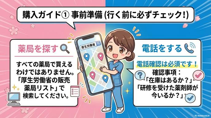 まず最初に行うべきは、近所のどこの薬局で買えるかを調べることです。すべての薬局で売っているわけではないため、厚生労働省のホームページなどで公開されている「販売薬局リスト」を確認します。そして、行く前には必ず電話で確認をしましょう。「在庫があるか」「対応できる薬剤師(研修修了者)が今いるか」を確認するためです。せっかく足を運んでも、薬剤師が不在で購入できないというケースを防ぐためにも、事前の電話は必須です。