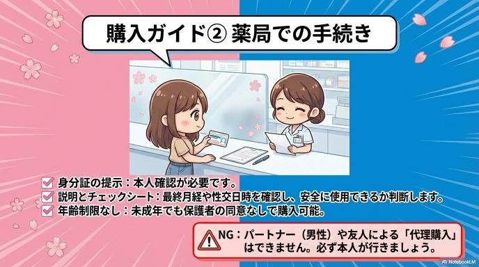 購入に関してよくある疑問についても知っておきましょう。まず年齢制限についてですが、今回のOTC化では年齢による制限はなく、未成年でも保護者の同意なしで購入することができます。これは「親に知られたくない」という事情で薬を諦めることがないように配慮されたものです。一方で、購入できるのは服用する「本人(女性)」だけです。パートナーの男性が代理で買いに行ったり、友人の分を買ったりすることはできません。必ず本人が薬局に行き、説明を受ける必要があります。