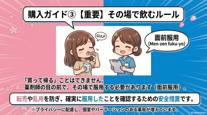 「市販化」といっても、風邪薬や頭痛薬のように、棚から商品を取ってレジでお会計をするわけではありません。転売や乱用を防ぐため、非常に厳格なルールが設けられています。購入時には必ず専門の研修を受けた薬剤師から説明を受け、その場の「薬剤師の目の前」で薬を服用しなければなりません。つまり、薬を買って家に持ち帰ることはできないのです。これは安全性を確保するための措置ですが、プライバシーを気にする人にとっては、心理的な負担を感じる要因の一つともなっています。