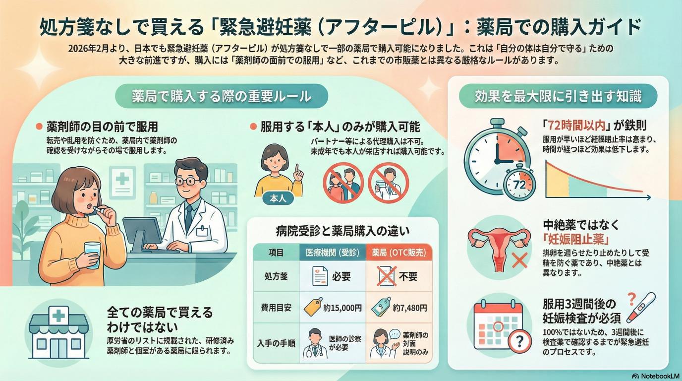 2026年2月2日、日本の医療における歴史的な一歩となる制度がスタートしました。予期せぬ妊娠を防ぐための「緊急避妊薬(アフターピル)」が、医師の処方箋なしで、一部の薬局で購入できるようになったのです。これまで病院での受診が必須だったこの薬が、身近な薬局で手に入るようになったことは、多くの人にとって大きなニュースとなりました。この変化は単に薬が買いやすくなったというだけでなく、私たちが自分の体を自分で守るための選択肢が広がったことを意味しています。
