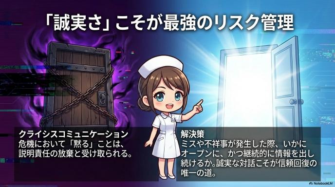 - 「誠実さ」こそが最強のリスク管理: ミスや不祥事が発生した際、いかにオープンに、かつ継続的に情報を出し続けるかが、組織の真価を決めます。