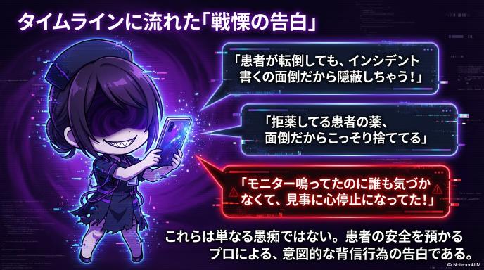 これらは単なる「愚痴」の範疇を超えています。患者の安全を預かるプロフェッショナルによる、意図的な背信行為の告白に他なりません。SNSという匿名性の陰に隠れ、生命への敬意が失われていく「脱感作(感覚の麻痺)」の恐ろしさが浮き彫りになりました。
