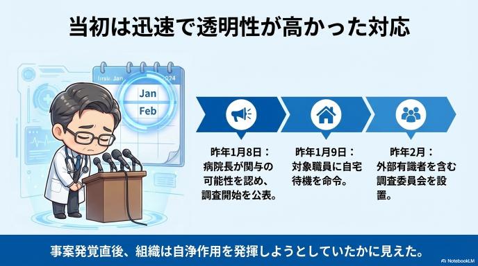 事案が発覚した際、病院側の対応は当初、非常にスピーディーで透明性が高いものでした。