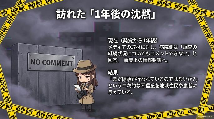 この「沈黙」が、さらなる疑念を生んでいます。何が事実で、どのような改善が行われたのか。それが見えない状況は、地域住民や患者に「まだ隠蔽が行われているのではないか?」という二次的な不信感を与えてしまっているのです。
