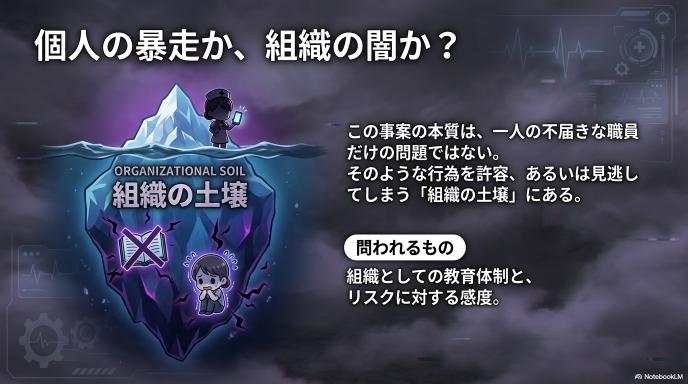 この事案の本質は、一人の不届きな職員がいたことだけではありません。より深刻なのは、そのような行為を許容、あるいは見逃してしまう「組織の土壌」にあります。