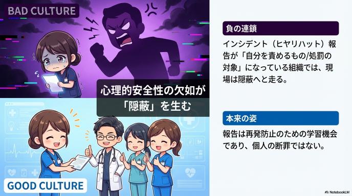 - 心理的安全性の欠如: インシデント(ヒヤリハット)報告が「自分を責めるもの」になっていると、現場は隠蔽へと走ります。