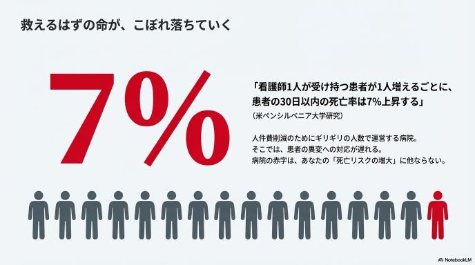 米ペンシルベニア大学の研究では、「看護師1人が受け持つ患者が1人増えるごとに、患者の30日以内の死亡率が7%上昇する」という衝撃的なデータが示されています。 人件費削減のためにギリギリの人数で回している病院では、患者の異変に気づくのが遅れ、救えるはずの命がこぼれ落ちる。財務の悪化は、そのまま「死亡リスクの増大」に直結しています。