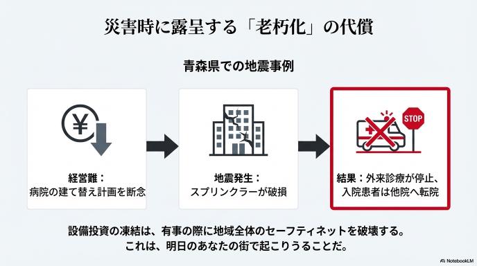 青森県で発生した地震では、以前から建て替えが計画されていたものの、経営難で断念していた病院が被災しました。 スプリンクラーの破損によって外来が停止し、入院患者の転院を余儀なくされる事態に。設備投資を凍結せざるを得ない経営状況は、災害大国・日本において、地域全体の安全保障を喪失させているのです。