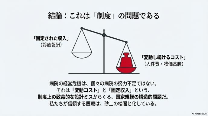 病院の経営危機は、個々の病院の努力不足や、ましてや地方だけの問題ではありません。それは、「変動するコスト」と「固定された収入」という、制度上の致命的な設計ミスからくる、国家規模の構造的問題です。