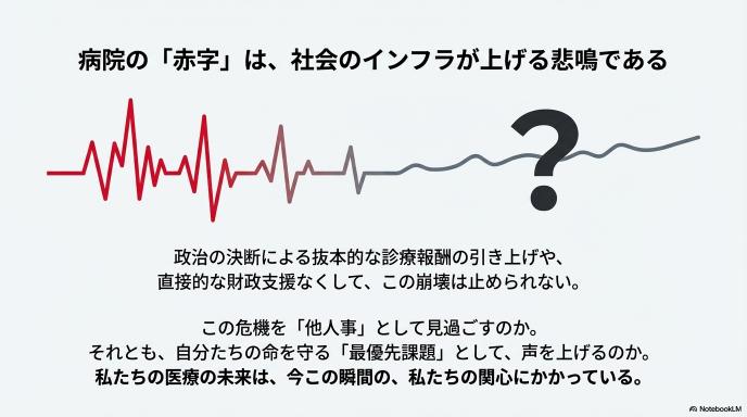 病院の「赤字」は、社会のインフラが悲鳴を上げているサインです。この危機を「他人事」として見過ごすのか、それとも自分たちの命を守る「最優先課題」として声を上げるのか。