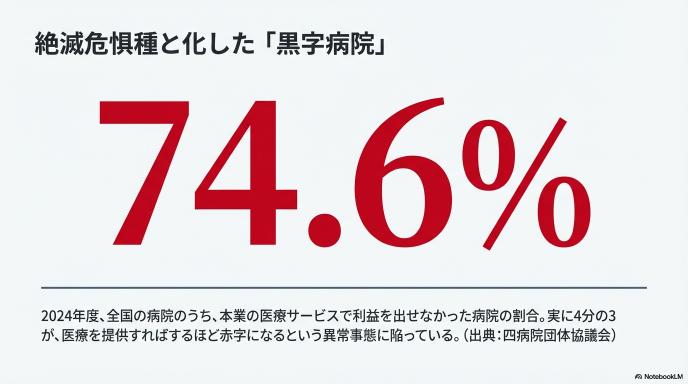 最新の調査結果は、もはや「経営努力」という言葉では片付けられない、日本の病院が直面している構造的な死を浮き彫りにしました。本業で赤字を出す病院が4分の3に達し、都市部から地方まで、医療の提供体制そのものが断崖絶壁に立たされています。