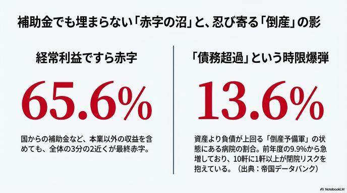 さらに深刻なのは、資産よりも負債が上回る「債務超過」の状態にある病院が13.6%に上ることです。前年度の9.9%から急増しており、10軒に1軒以上の病院が、いつ資金ショートを起こして閉院してもおかしくない「倒産リスク」を抱えて運営を続けています。