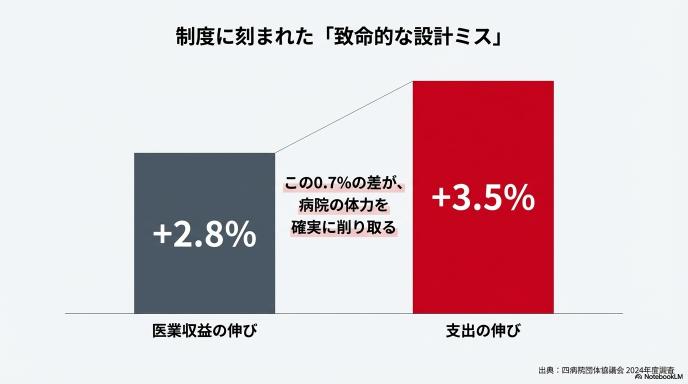 最新データでは、医業収益(売上)は前年比で2.8%増加しました。しかし、それを嘲笑うかのように支出は3.5%も増加しています。 この「わずか0.7ポイントの差」が、病院の体力をジワジワと、確実に削り取っています。