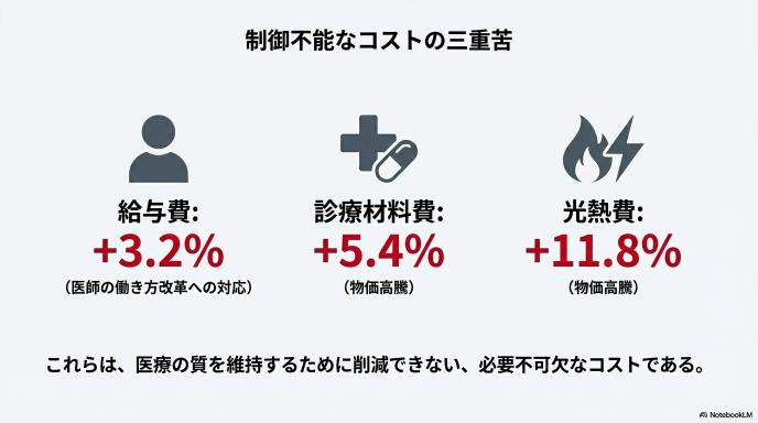- 物価の暴走: 診療材料費は5.4%増、光熱費(特にガス代)は11.8%増。