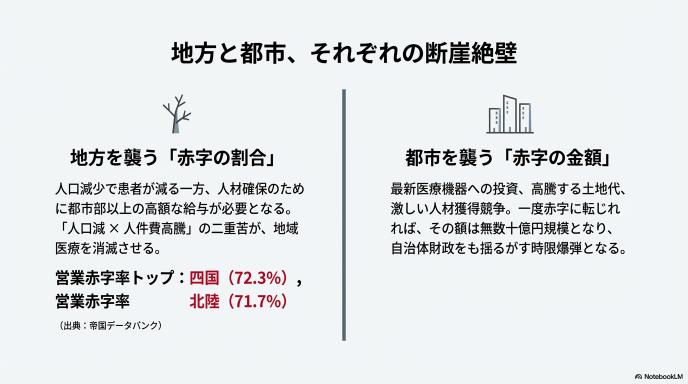 帝国データバンクの調査によれば、営業赤字の病院の割合が最も高いのは四国(72.3%)、次いで北陸(71.7%)です。 人口減少で患者の母数が減る一方で、医師や看護師を確保するために、都市部以上の「高額な給与」を提示しなければならない。この「人口減×人件費高騰」の二重苦が、地方医療を文字通り消滅させようとしています。