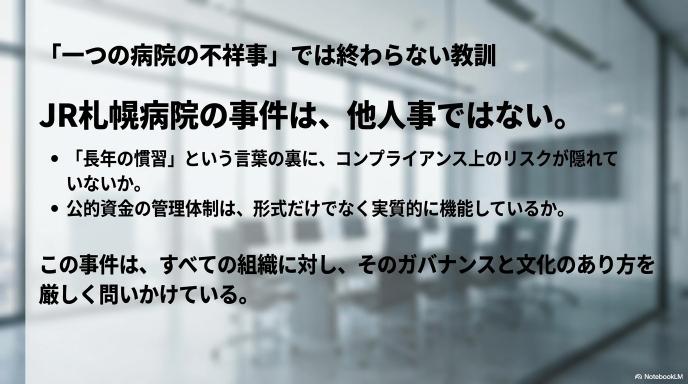 「長年の慣習」という言葉の裏に隠された不正の実態。 この事件は、一つの病院の不祥事にとどまらず、組織としてあるべき姿や、公的資金の管理のあり方について、私たちに重い問いを投げかけています。