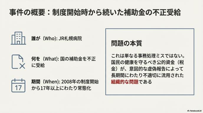 JR札幌病院が、国の補助金を17年あまりにわたって不正に受け取っていた問題が明らかになりました。 「病院の不正請求」という言葉を聞いても、少し遠い世界の出来事に感じるかもしれません。しかし、このニュースの核心は、私たちの生活を支える「税金」が長期間にわたって不適切に使われていたという点にあります。
