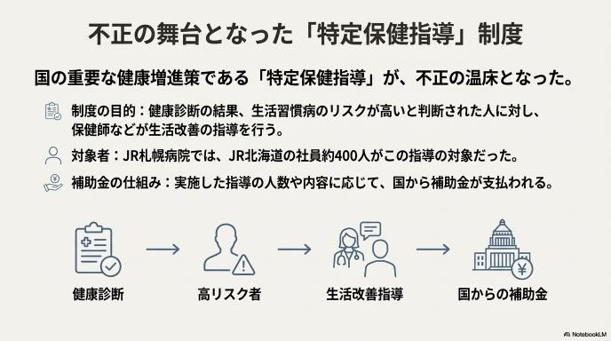 今回、不正の舞台となったのは「特定保健指導」という制度です。 これは、健康診断の結果で生活習慣病のリスクが高いと判断された人に対し、保健師などの専門家が生活改善のアドバイス(指導)を行うものです。国民の健康を守るための、国の大切な仕組みの一つです。