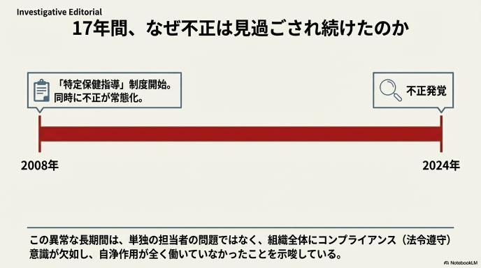 さらに衝撃を与えたのは、この不正が17年あまりという異常な長期間にわたって続いていた事実です。