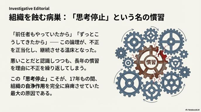 悪いことだと分かっていても、「前任者もやっていたから」「ずっとこうしてきたから」という理由で不正を続けてしまう。この思考停止こそが、17年もの間、自浄作用を働かせなくしていた最大の原因です。