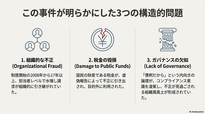 1. 組織的な不正:制度開始の2008年から17年以上、水増し請求が続いていた。