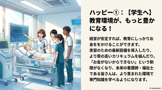 経営が安定すれば、教育にお金をかけることができます。 実習設備の更新や、より質の高いカリキュラムの導入が可能になります。「お金がないからできない」という制限がなくなり、学生はより恵まれた環境で学ぶことができるようになるでしょう。