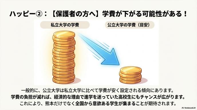 一般的に、公立大学は私立大学に比べて学費が安く設定される傾向にあります。 今回の計画でも「学生確保」が大きな目標の一つです。学費の負担が減れば、経済的な理由で進学を迷っていた高校生にもチャンスが広がります。これにより、全国から意欲ある学生が集まることが期待されます。