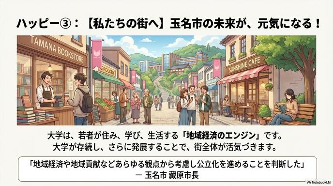 大学があることで、若者が街に住み、生活し、買い物をします。教職員も働きます。大学は「地域経済のエンジン」なのです。もし大学がなくなってしまえば、街の灯が一つ消えるようなもの。公立化して大学を守ることは、玉名市の未来を守ることと同義なのです。