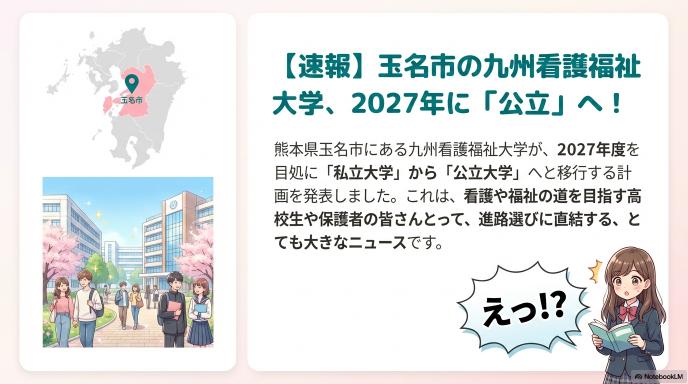 最近、熊本県玉名市にある九州看護福祉大学に関する大きなニュースが飛び込んできました。なんと、2027年度を目処に「私立大学」から「公立大学」へと生まれ変わる計画が発表されたのです。
