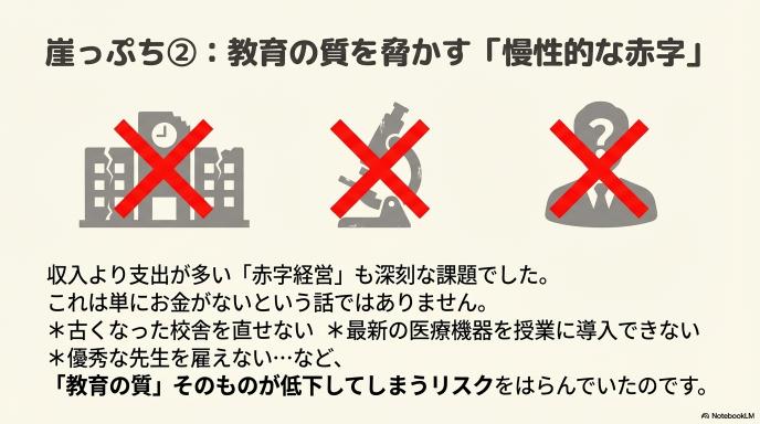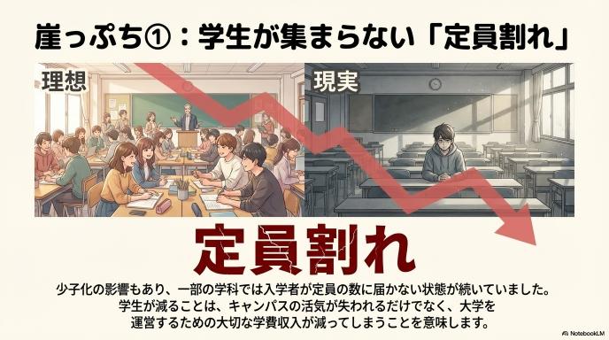 そもそも、なぜ今まで通り私立大学として運営を続けないのでしょうか。そこには、大学単独の努力だけでは解決が難しい、現代の大学が直面する「2つの崖っぷち」がありました。
