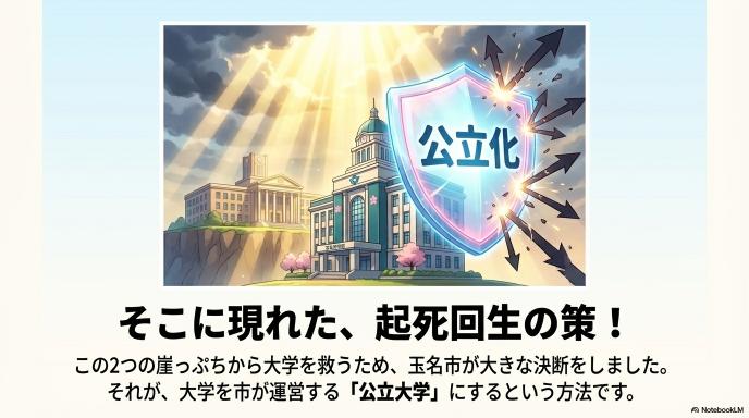 - 解決策: 玉名市が大学を「公立化」する決断をした。