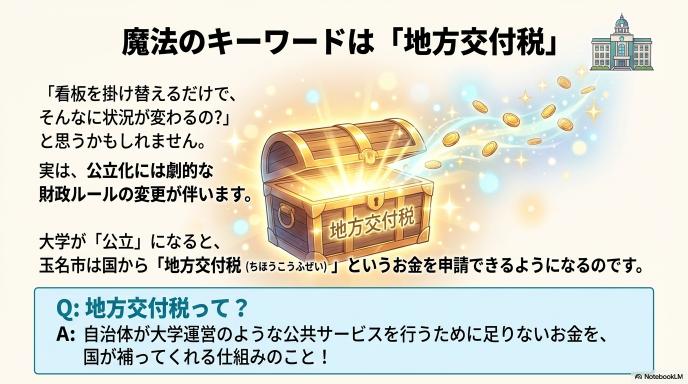 ここがこの記事で一番大切なポイントです。 大学が「私立」から「公立(玉名市が運営)」になると、玉名市は国に対して**「地方交付税(ちほうこうふぜい)」**というお金を申請できるようになります。