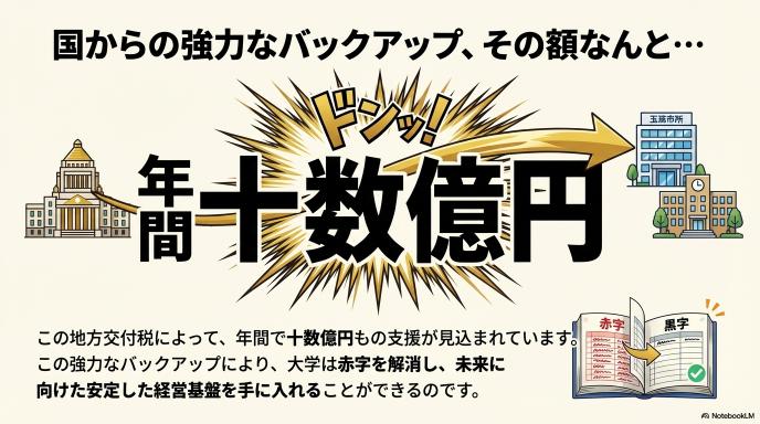 この国からの強力なバックアップ(地方交付税)が入ることで、大学は赤字を解消し、安定した経営基盤を手に入れることができるのです。
