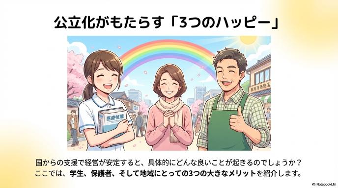 - 効果: 国から「地方交付税」が入り、経営が安定。教育の質向上や学費低減が期待できる。