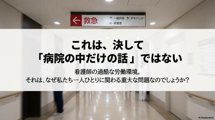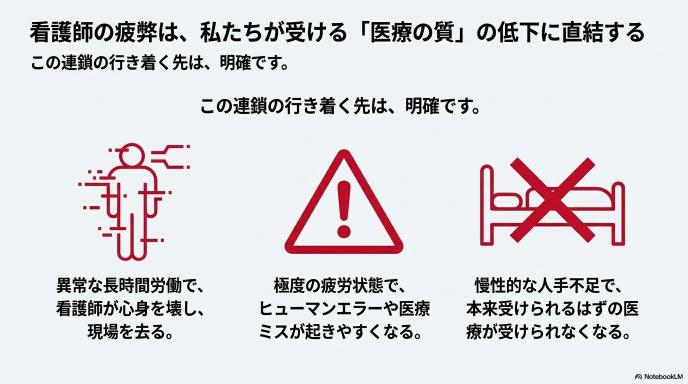 これは、私たちがいつか病気やケガをしたときに受ける「医療の質」に直結する問題です。つまり、看護師さんを守ることは、巡り巡って私たち自身の命を守ることと同じなのです。