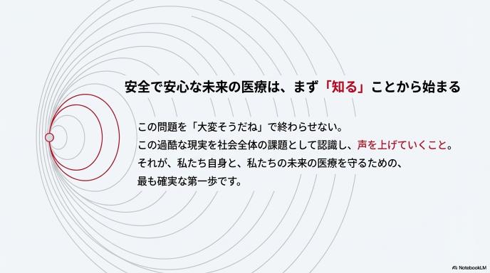 「大変そうだね」で終わらせず、この過酷な現状を社会全体でどう変えていくべきか。安全で安心な未来の医療を作るためには、まず私たちがこの現実を知り、声を上げていくことが第一歩になるはずです。