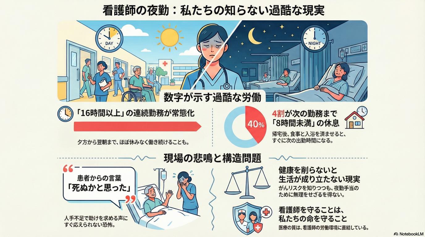 看護師さんの夜勤問題は、決して「病院の中だけの話」ではありません。