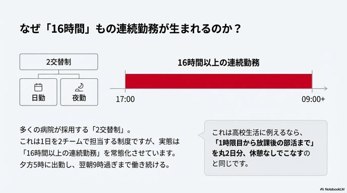 これは、例えば夕方の5時に出勤したら、翌朝の9時過ぎまで一睡もせずに(あるいはわずかな仮眠だけで)働き続けるということです。高校生の皆さんの授業時間に例えるなら、「1時限目から放課後の部活まで」を2日分、ぶっ続けでこなすようなもの。そう考えると、どれほど異常な長さかが分かるはずです。