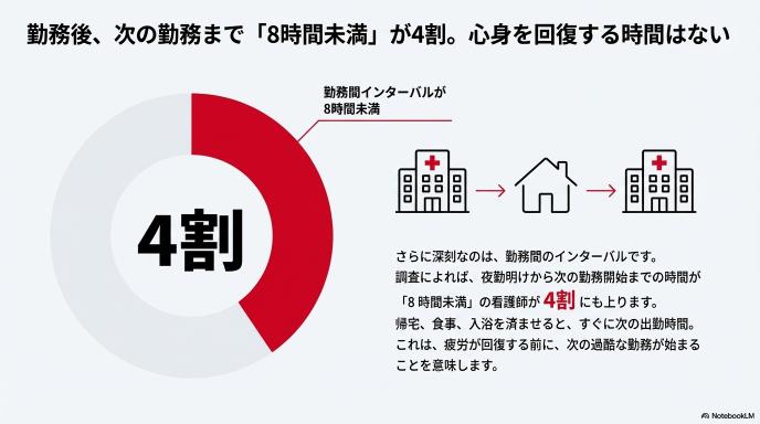 さらに深刻なのが、仕事が終わった後の休み時間です。調査では、夜勤が終わってから次の勤務が始まるまでの時間が「8時間未満」というケースが4割もありました。