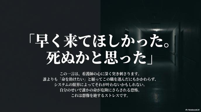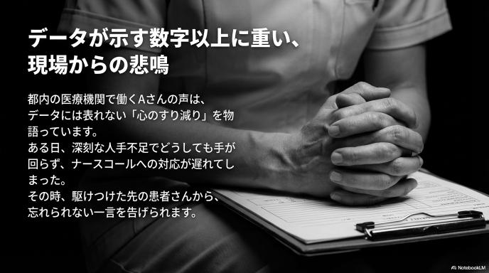 看護師さんは、誰よりも「助けたい」と思ってその仕事を選んだ人たちです。それなのに、あまりの忙しさに手が届かない。自分のせいで誰かの命が危険にさらされるかもしれないという恐怖は、想像を絶するストレスです。