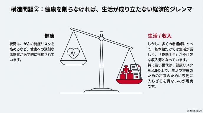 驚くべきことに、これほど現場が悲鳴を上げているのに、病院の経営が苦しいという理由で「夜勤の人数をさらに減らそう」という動きさえあると言います。これでは、患者さんの安全を守るための防波堤が、内側から崩されていくようなものです。