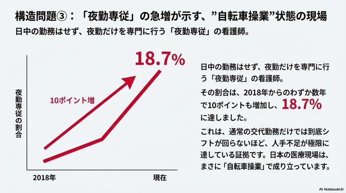 日中の仕事はせず、夜勤だけを専門にこなす「夜勤専従(せんじゅう)」の看護師さんも増えています。その割合は、2018年からのわずか数年で10ポイントも増加し、18.7%に達しました。