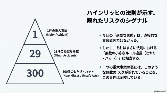 つまり、患者の死因を究明しようとメスを入れた結果、直接の関係はないはずの「職員たちの怠慢」という別の病巣が、芋づる式に見つかってしまったのです。これは病院側にとっても、また当事者たちにとっても、予想外の展開だったと言えるでしょう。一つの重大事故の裏には、無数の小さなルール違反が隠れているという「ハインリッヒの法則」を地で行くような展開が、現実の病院で起きていたのです。