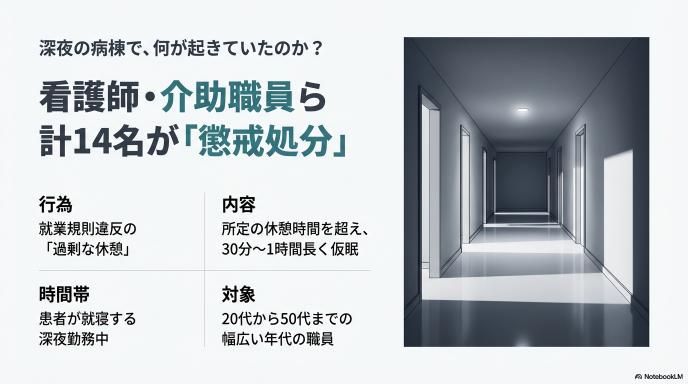 問題の舞台となったのは、主に深夜の時間帯でした。患者が就寝し、病棟が静まり返る夜勤の時間帯。本来、医療現場における夜勤は常に緊張感が求められる過酷な業務ですが、今回処分を受けた職員たちは、決められた休憩時間を超えて、さらに30分から1時間ほど長く仮眠を取っていたのです。